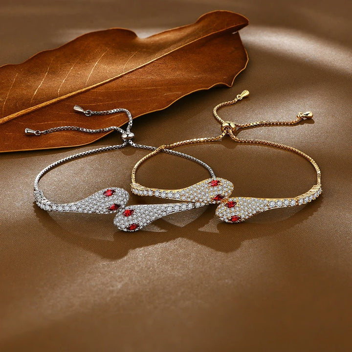 Unleash your inner power with our Double Snake Head Moissanite Bracelet – a symbol of strength, rebirth, and eternal elegance. Crafted in genuine 925 sterling silver and plated with 18K gold, this striking bracelet features dazzling D Color VVS1 Moissanite stones and deep red accents that create a bold yet luxurious statement.