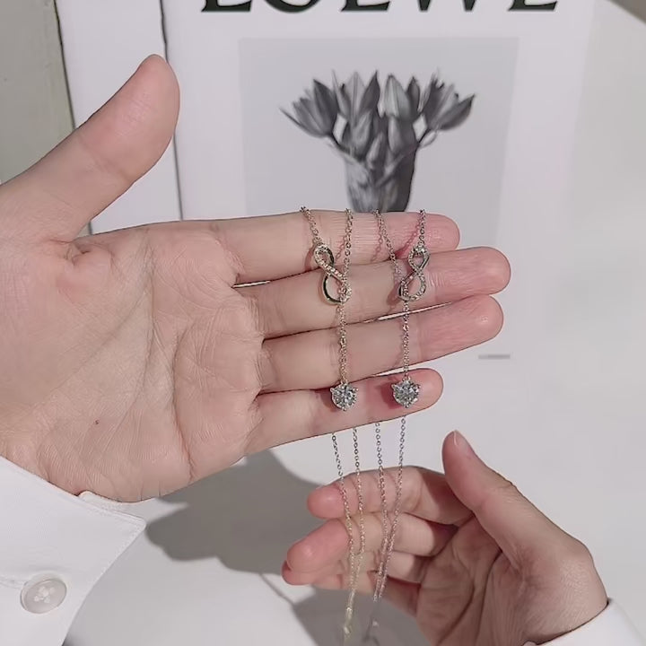 A symbol of endless love and elegance β the Infinite Heart Moissanite Necklace is crafted in genuine 925 sterling silver and set with dazzling D-color Moissanite stones (6.5mm, 2.5mm & 1mm). The delicate infinity design meets a sparkling heart drop, making it a timeless statement piece for anniversaries, birthdays, or simply celebrating yourself.