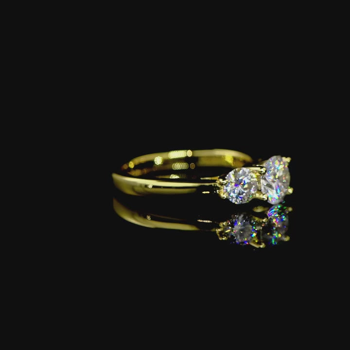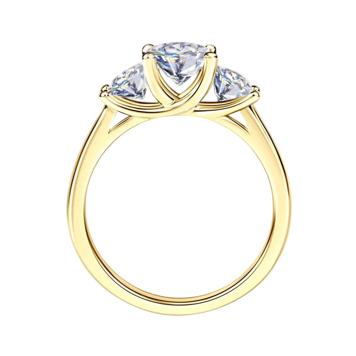The three-stone design symbolizes love’s journey – past, present, and future – making it the perfect promise ring, wedding band, or anniversary gift.