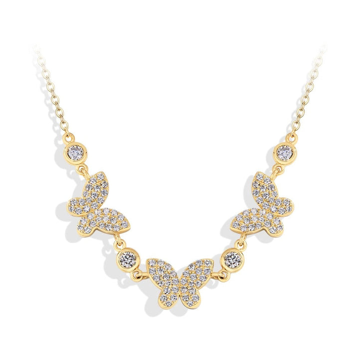 Graceful and radiant — this Luxury Butterfly Moissanite Necklace captures the essence of transformation and timeless beauty. Handcrafted from genuine 925 sterling silver and plated in 18K gold, it features three sparkling butterfly pendants set with D Color VVS1 Moissanite stones that shimmer like real diamonds.