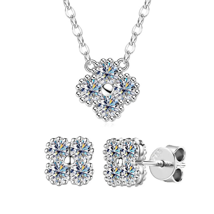 Shine with minimal luxury elegance ✨ This Moissanite Clover Jewelry Set is crafted from 100% 925 sterling silver, available in classic silver or gold finish. The set includes a delicate clover pendant necklace and matching stud earrings – each adorned with 3mm D Color Moissanite stones that rival the brilliance of natural diamonds.