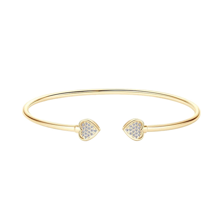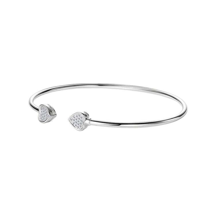 A delicate expression of love and elegance. The Moissanite Heart Cuff Bracelet is crafted from 100% 925 sterling silver, plated in gold or rhodium, and finished with pavé D Color Moissanite stones on each heart-shaped end. Minimal yet radiant, this bracelet is a timeless piece designed to be cherished.