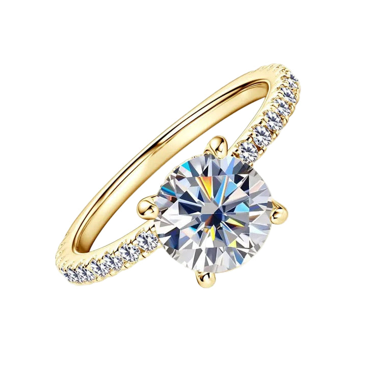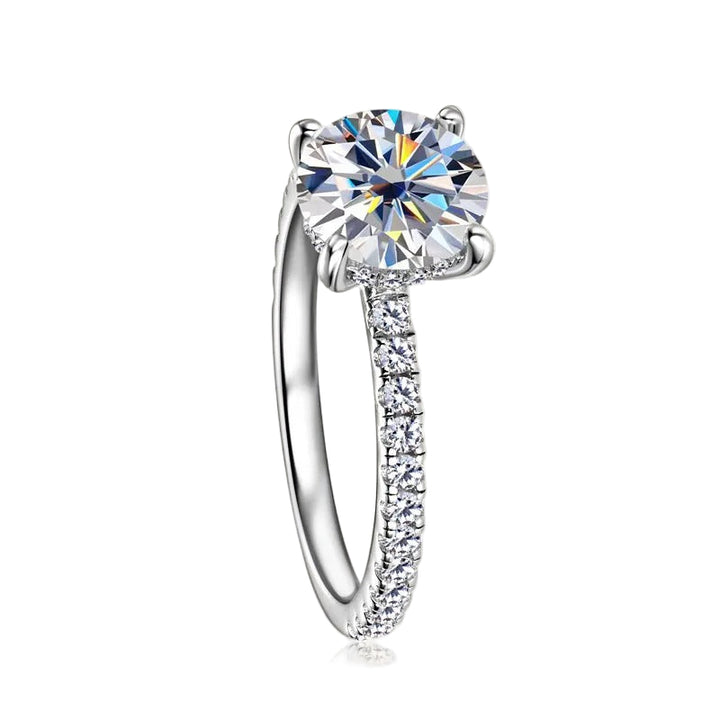 A true symbol of timeless elegance. The Moissanite Solitaire Ring features a brilliant round-cut D Color Moissanite center stone, set on a sleek band of 925 sterling silver, plated in rhodium or gold. The band is accented with pavé Moissanite for an added touch of sparkle.