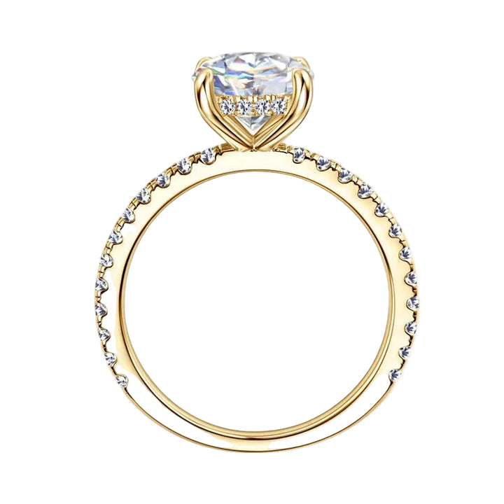 - Round-cut solitaire center stone with pavé band