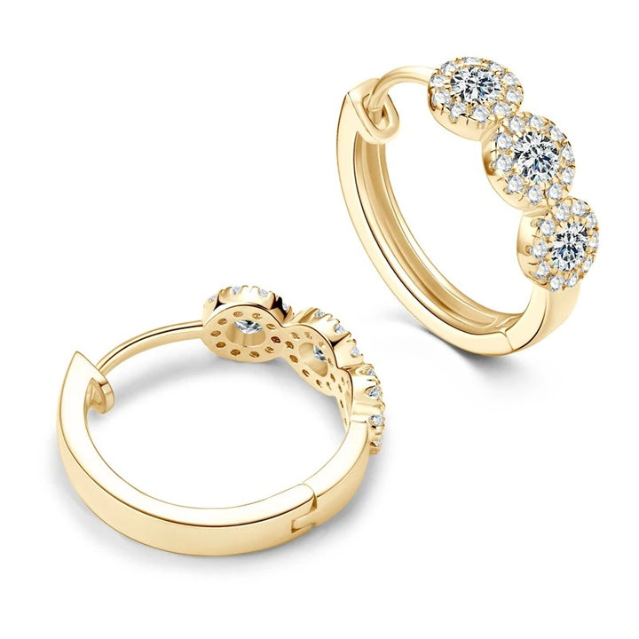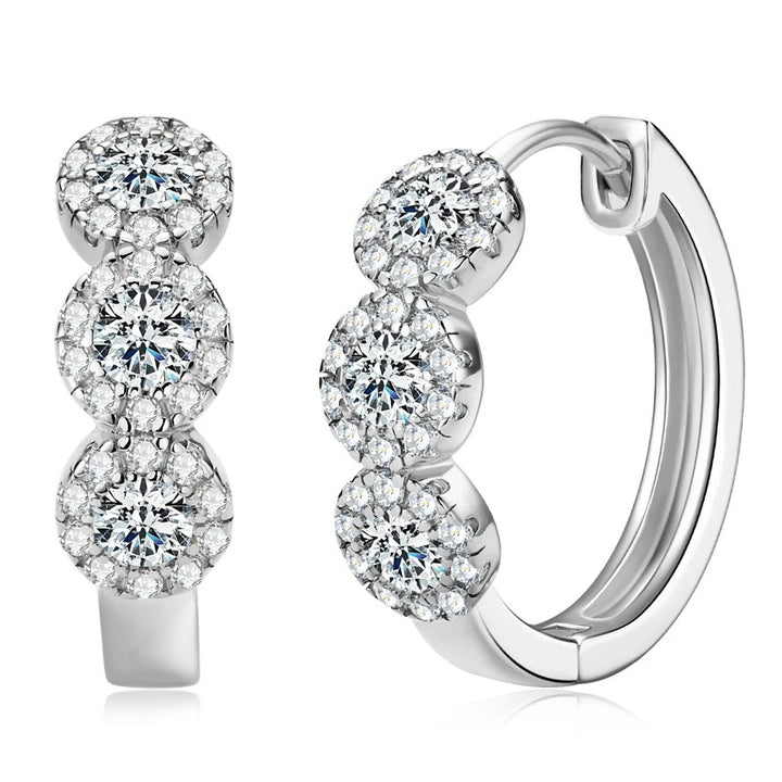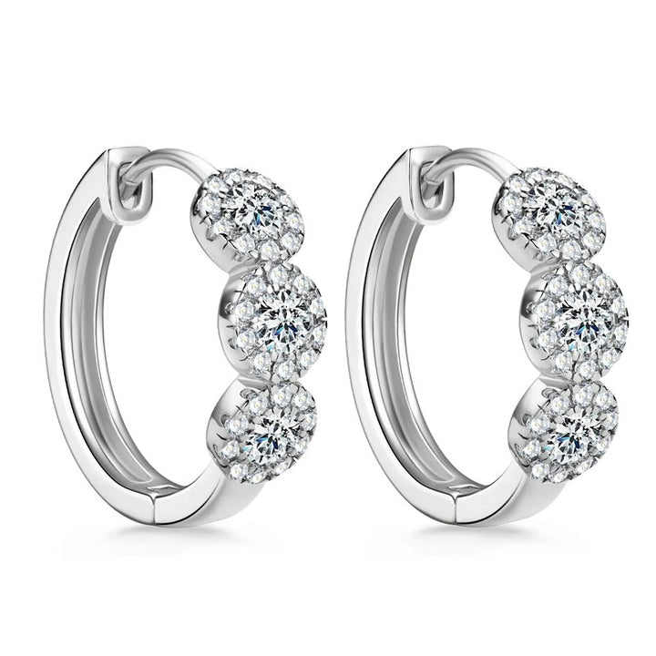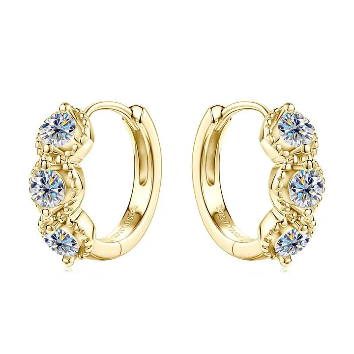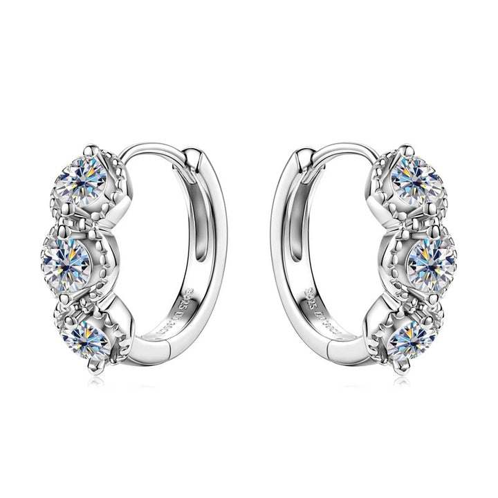 A modern classic with timeless sparkle. The Moissanite Three-Stone Hoop Earrings feature brilliant 2.7mm & 3mm D Color VVS1 Moissanite stones set in a sleek huggie hoop silhouette. Crafted from 925 sterling silver, plated in rhodium or gold, these earrings are designed to shine with elegance every day.