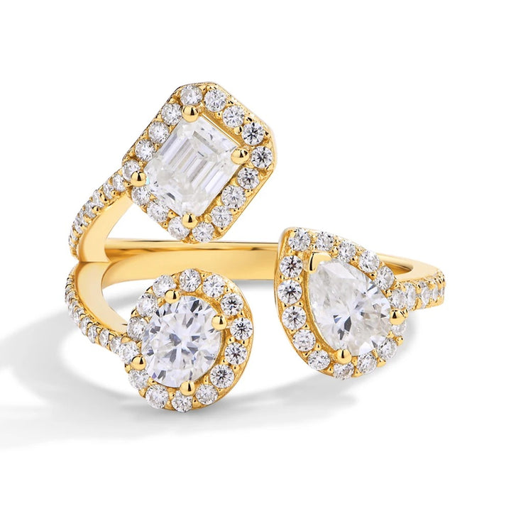A statement of elegance and individuality — our Three Stone Moissanite Ring embodies the art of timeless luxury. Handcrafted from genuine 925 sterling silver and plated in 18K white or yellow gold, this captivating design features three unique Moissanite cuts — round, emerald, and pear — symbolizing the past, present, and future of love.